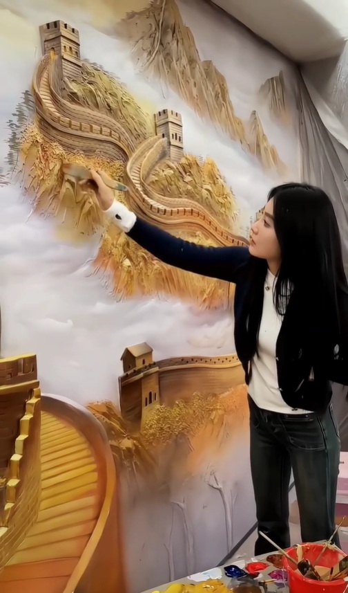 À partir d’un mur nu, cette artiste chinoise façonne à la main des bas-reliefs monumentaux d’un réalisme saisissant, avant de les peindre avec une précision qui évoque autant le cinéma que la peinture classique.