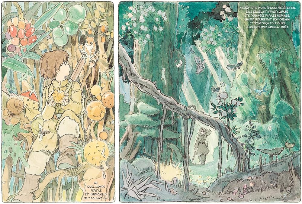 Le style graphique de Miyazaki dans cette œuvre se distingue par son approche picturale, influencée par l'aquarelle et les croquis esquissés à la main. Contrairement aux bandes dessinées classiques japonaises, qui adoptent souvent un trait net et détaillé, Miyazaki privilégie ici une fluidité visuelle qui confère au récit une atmosphère onirique et contemplative. Chaque planche semble respirer, les couleurs et les ombres créent une profondeur et une sensation de mouvement subtile.