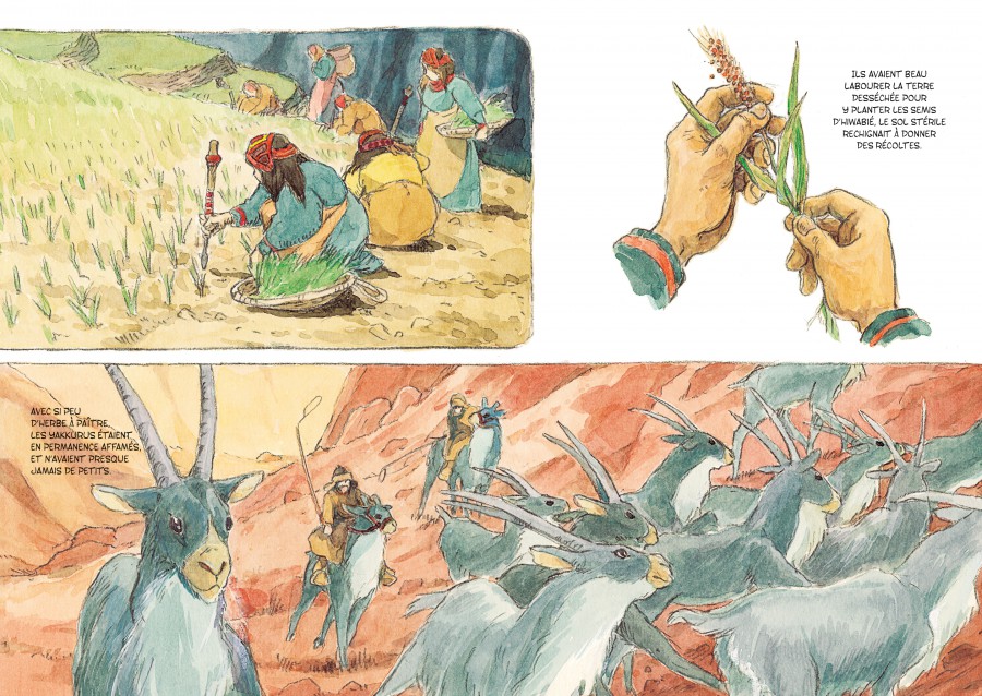 La lecture en sens japonais, de droite à gauche, contribue également à l’immersion dans cet univers hors du temps. Loin d’un manga conventionnel, Le Voyage de Shuna se rapproche davantage d’un roman graphique, où l’art et le récit s’entrelacent harmonieusement.