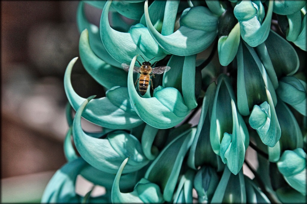 Attirée par le nectar, une abeille visite la fleur turquoise de Strongylodon macrobotrys, bien que la pollinisation naturelle soit principalement assurée par les chauves-souris. | © Cristoo