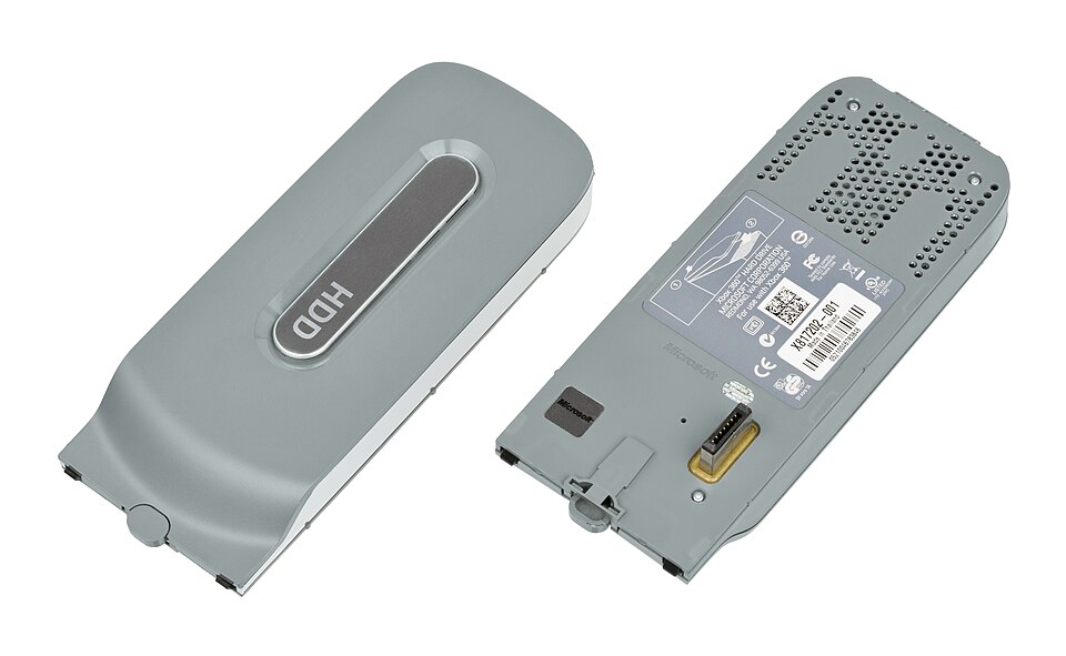 La Xbox 360 utilise principalement le DVD-ROM comme support physique, tout en proposant une distribution numérique via Xbox Live Marketplace. Un lecteur HD DVD externe a été commercialisé en option avant d’être abandonné. Le stockage interne varie selon les modèles, allant de 20 Go à 500 Go, via des disques durs propriétaires ou, sur les modèles S et E, des disques SATA 2,5" dans un boîtier spécifique. La console marque également une avancée majeure dans les services en ligne grâce à Xbox Live, permettant jeu en réseau, messagerie, contenus téléchargeables et mises à jour système.