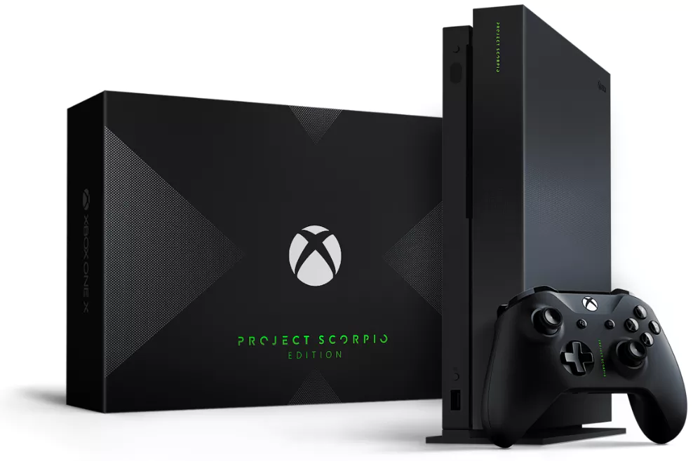 La Xbox One X, lancée en novembre 2017 sous le nom de code Project Scorpio, est la version haut de gamme de la famille Xbox One. Conçue pour le jeu en 4K natif, elle intègre le SoC Scorpio Engine avec un CPU Jaguar optimisé à 2,3 GHz, un GPU Radeon de 40 Compute Units à 1172 MHz (6 TFLOPS) et 12 Go de GDDR5. Elle propose un refroidissement par chambre à vapeur, une carte mère calibrée individuellement et le support du FreeSync, du 1440p et du 120 Hz. Compatible avec tous les jeux et accessoires Xbox One, elle offre des améliorations spécifiques via le programme Xbox One X Enhanced. La production cesse en 2020.