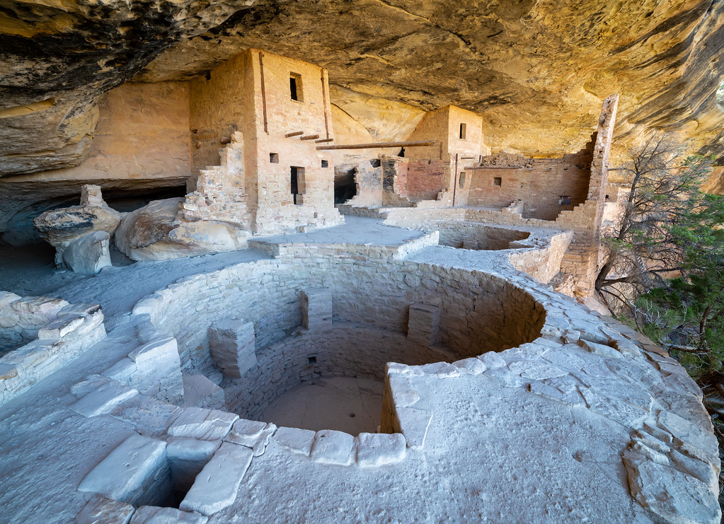 Spruce Tree House, l’un des villages troglodytiques les mieux préservés de Mesa Verde, s’abrite sous une vaste alcôve de grès dominant le canyon. Ses habitations en maçonnerie, ses kivas circulaires et son organisation en terrasses illustrent l’ingéniosité architecturale des Ancestral Pueblo au XIIIᵉ siècle. | © KimonBerlin