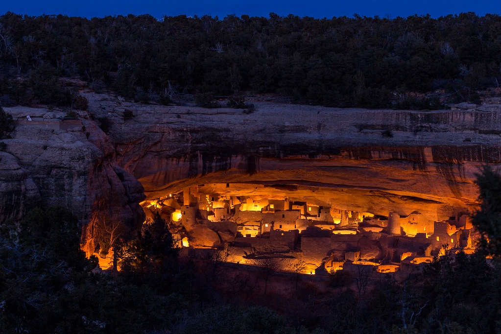 Sous la voûte sombre du canyon, un village de Mesa Verde s’illumine comme une constellation accrochée à la falaise. Les murs de grès, baignés de lumière dorée, révèlent en silence les traces d’une vie ancienne. Dans la nuit immobile, l’habitat des Pueblos ancestraux semble flotter entre roche et ciel, fragile éclat d’un monde disparu. | © Alexandre Patrier