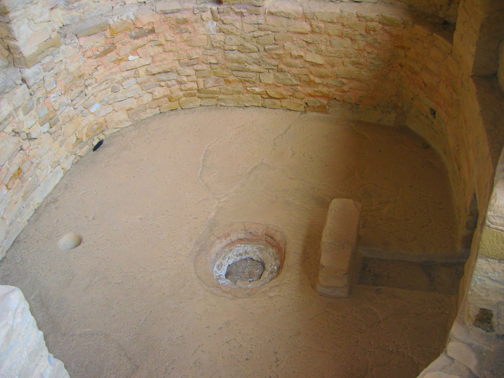 Une kiva de Balcony House, l’un des sites les plus spectaculaires de Mesa Verde. Comme les autres kivas, cette salle circulaire semi‑enterrée présente six pilastres soutenant la toiture, un foyer central, un système de ventilation et un sipapu symbolisant l’entrée des âmes dans le monde actuel. Nichée dans une alcôve difficile d’accès — aujourd’hui atteinte par échelles, tunnel et paroi équipée — cette kiva témoigne de la dimension rituelle de ce village du XIIIᵉ siècle. | © Ken Lund